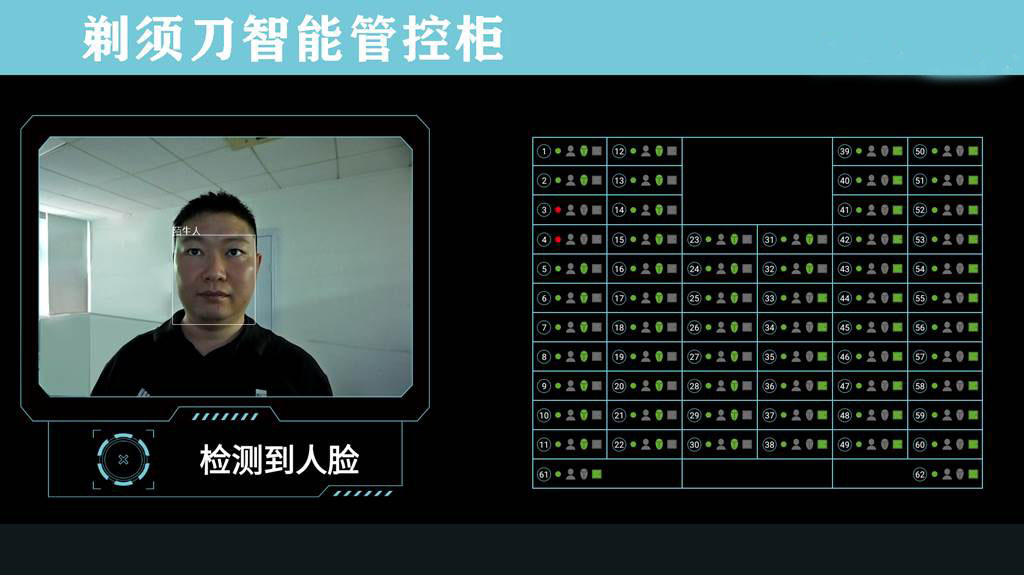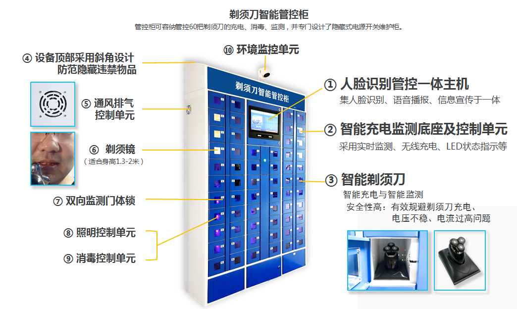和创剃须刀智能管控柜由管控机柜、人脸识别管控一体机、监测门体、无线充电监测控制单元、照明控制单元、消毒控制单元、通风排湿控制单元、剃须镜、环境监控摄像头、智能管控系统等组成。